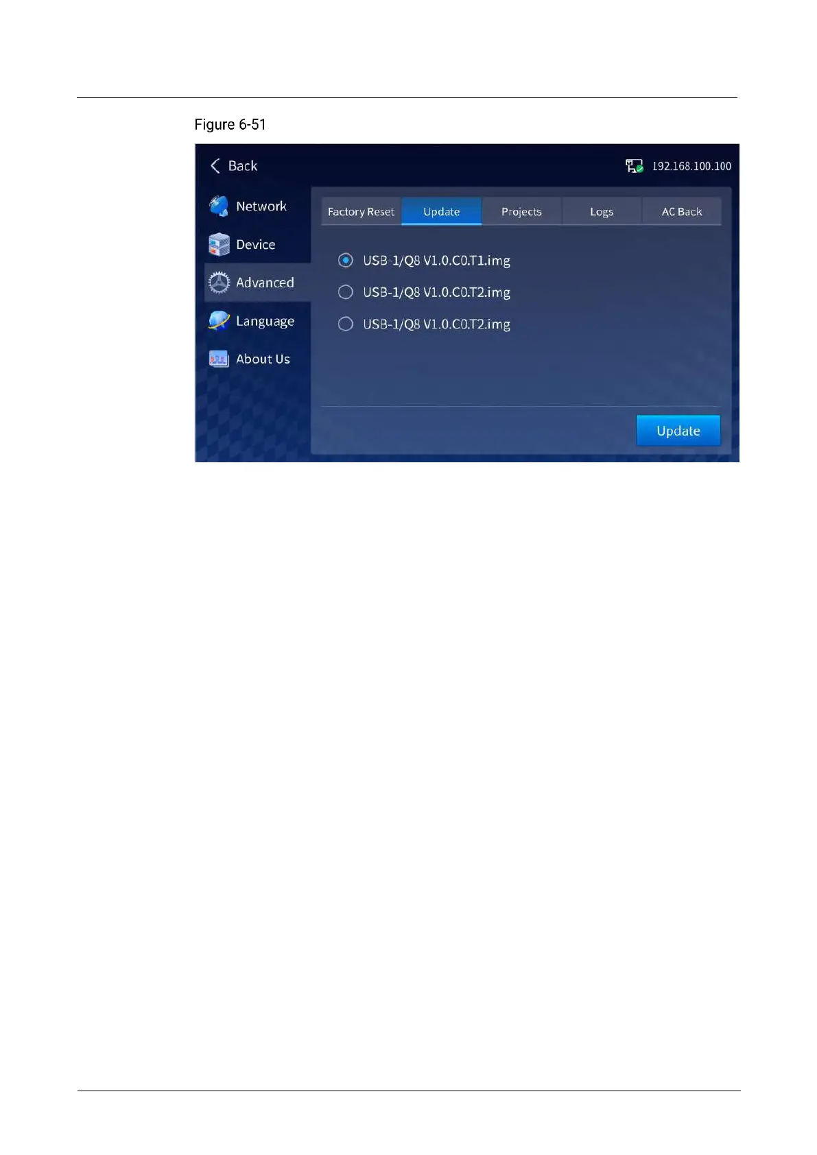 Select the target update file, tap Update, and the system will automatically update the