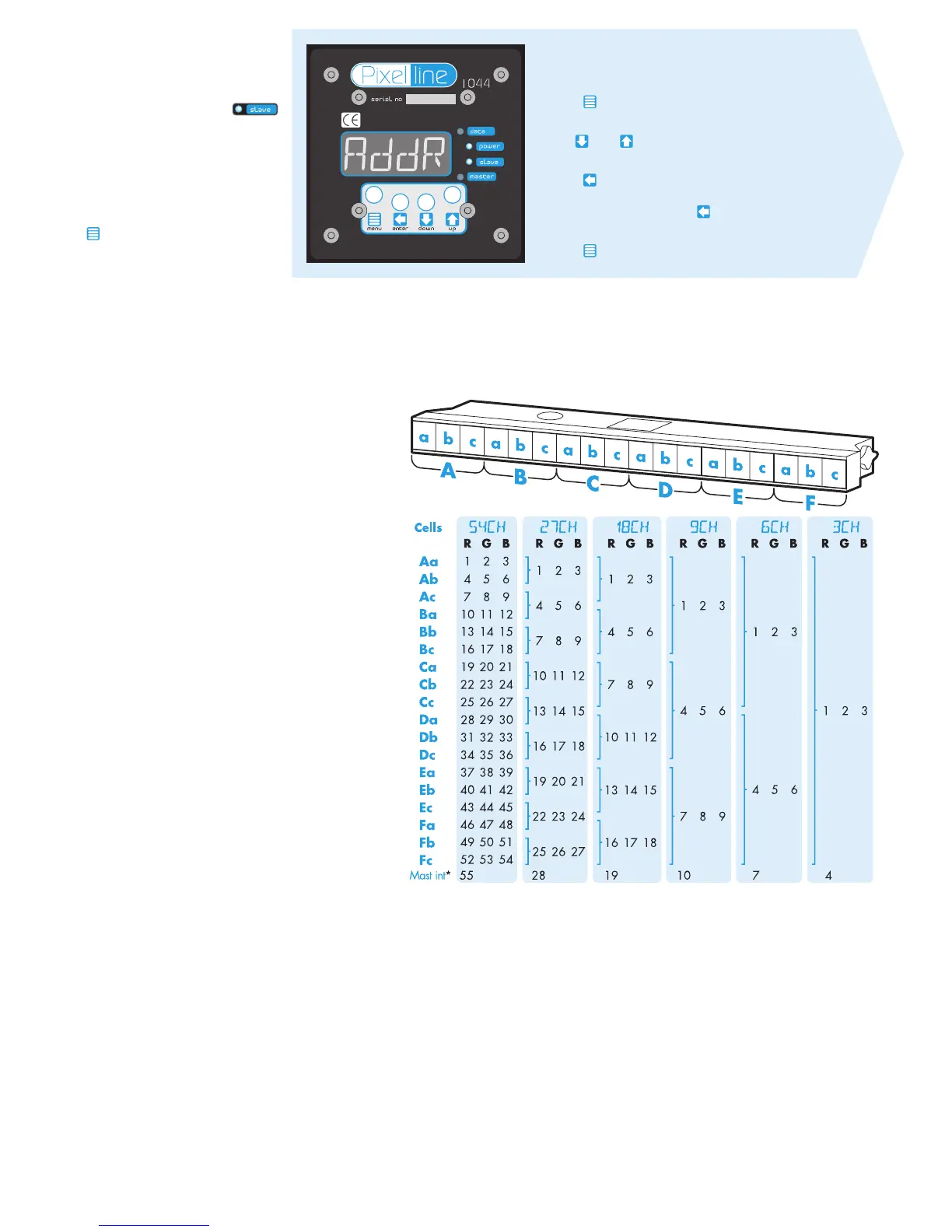 The first channel of the fixture occurs at the DMX address selected using ADDR