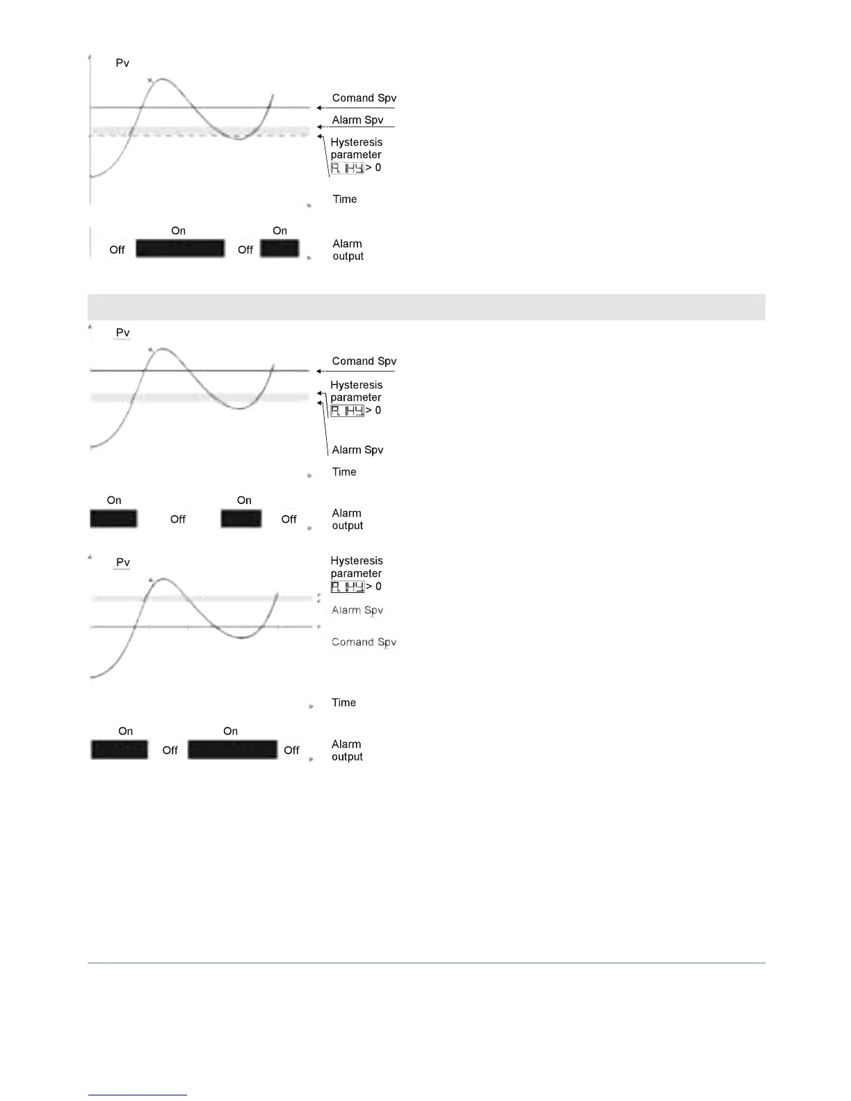 b) With hysteresis minor than “0” ( < 0) dotted line moves below alarm setpoint.