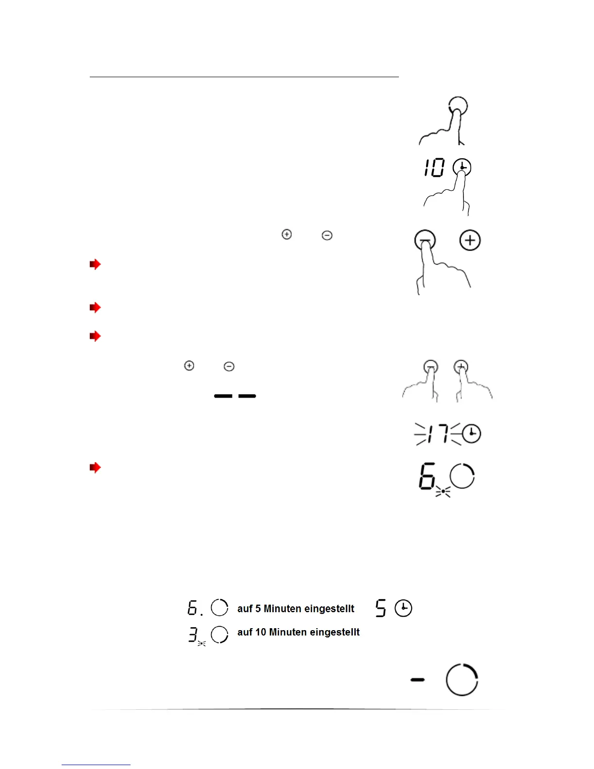 = 5 Minuten, Kochzone 4 = 10 Minuten. Die Timer-Anzeige zeigt 5 an. Der