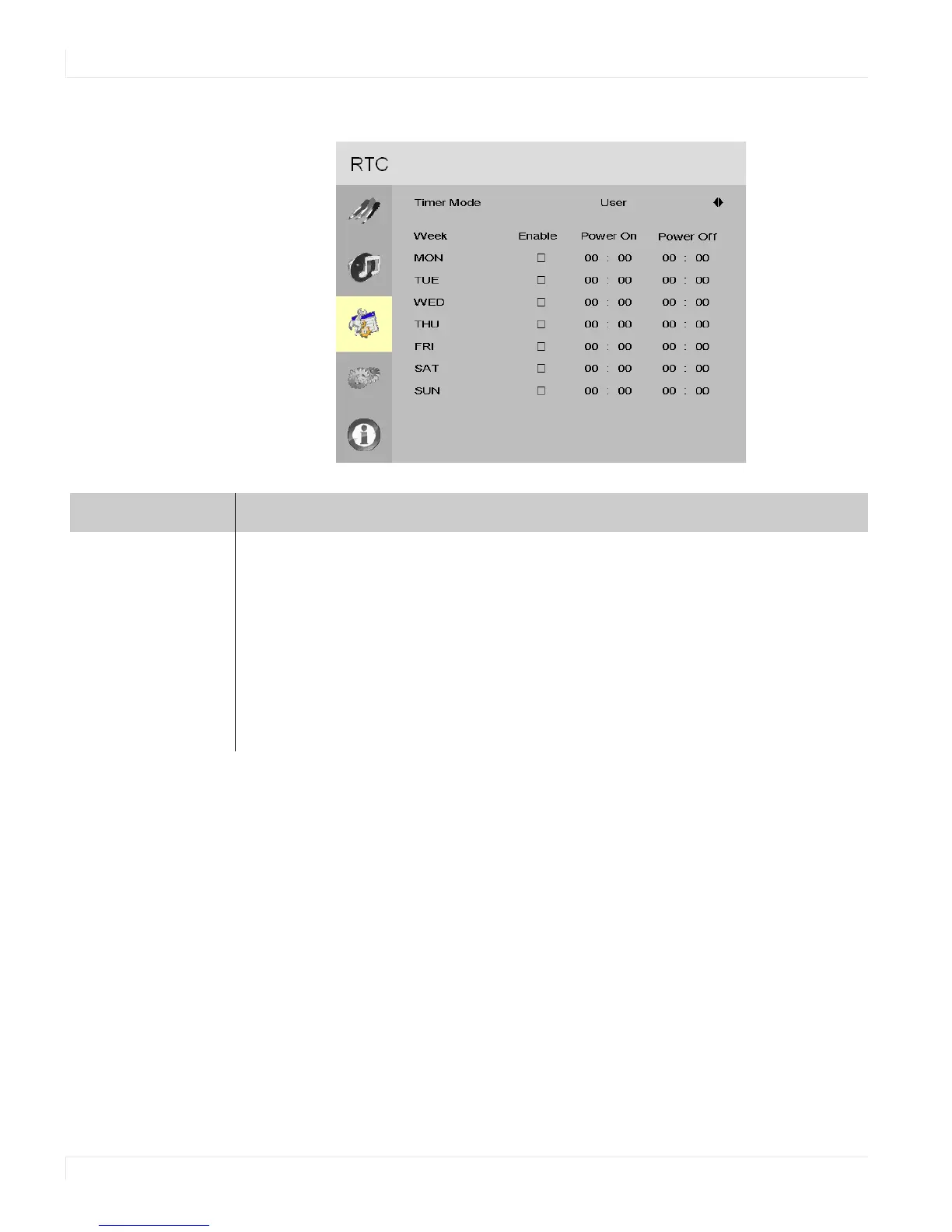 User mode Select the power on/off timer and specify the on/off times for each day of the week.