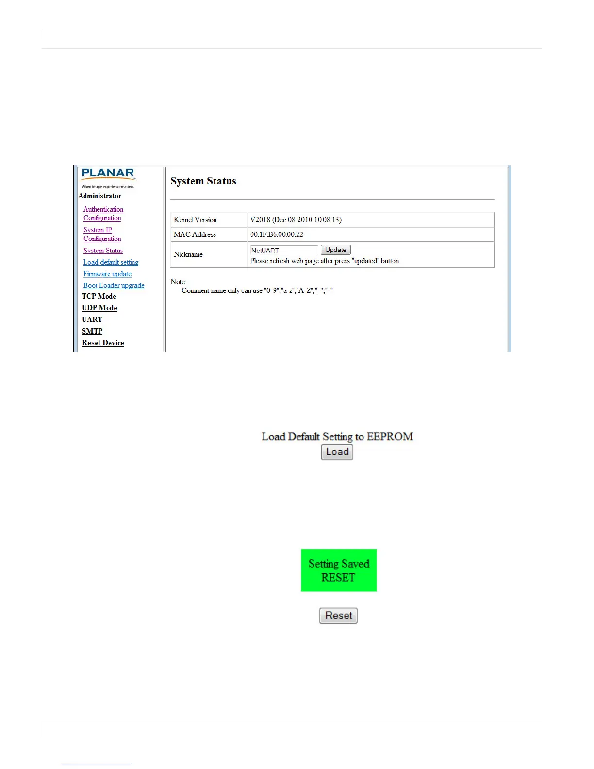 1 Click the LOAD button to return the network interface to default settings.