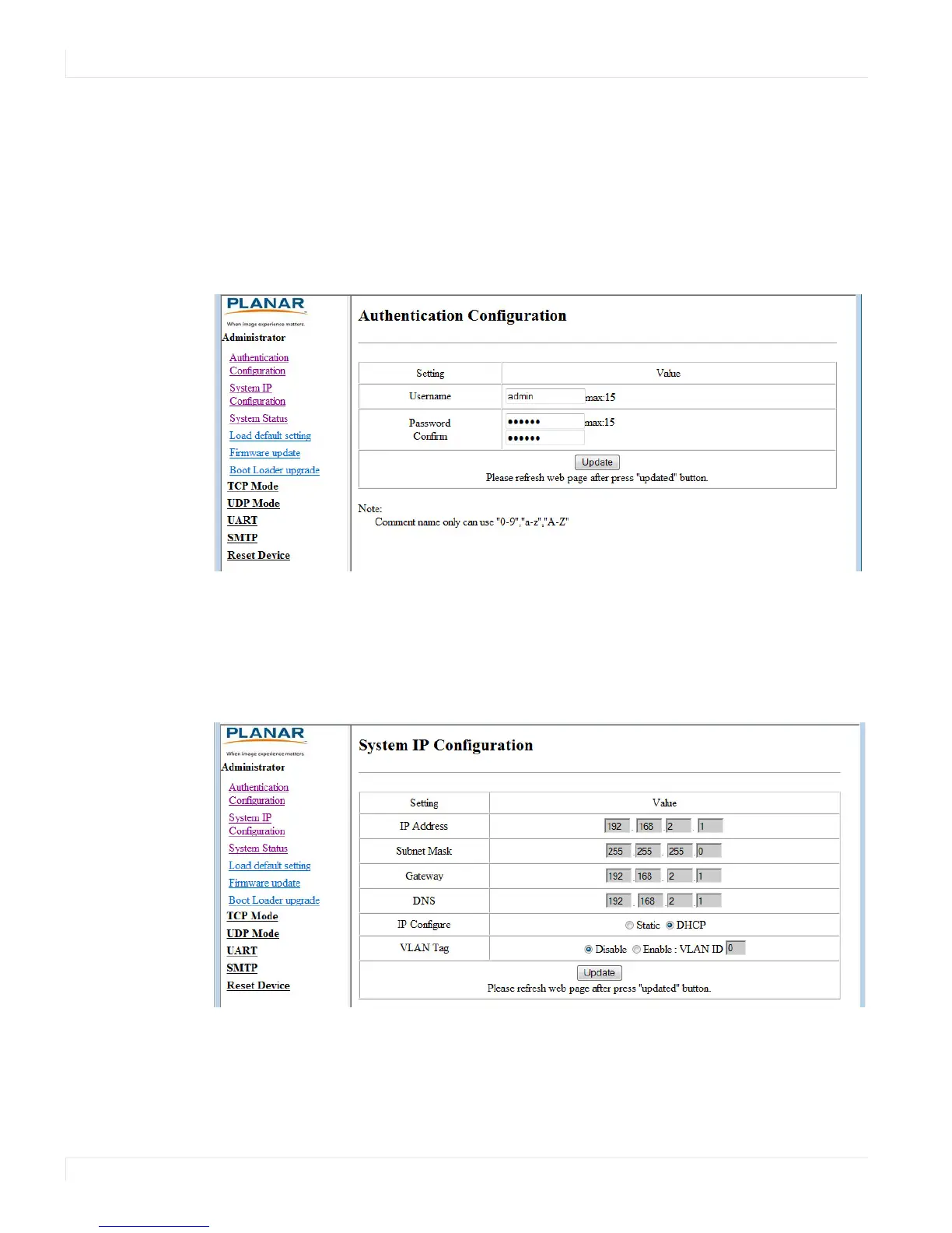 Click on the word Administrator under the Planar logo to show/hide these menu