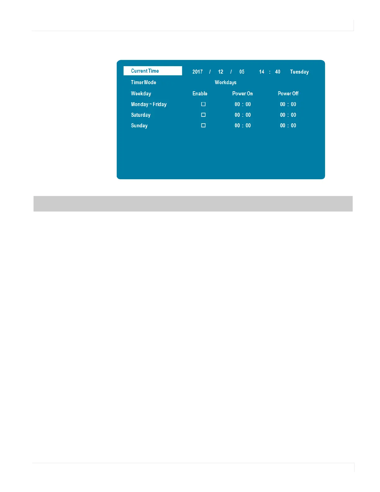 Select the power on/off time for Monday–Friday, Saturday, and Sunday