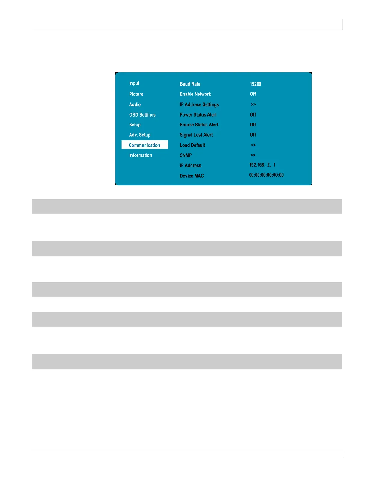 This menu configures the display’s RS-232 and Ethernet communication ports.