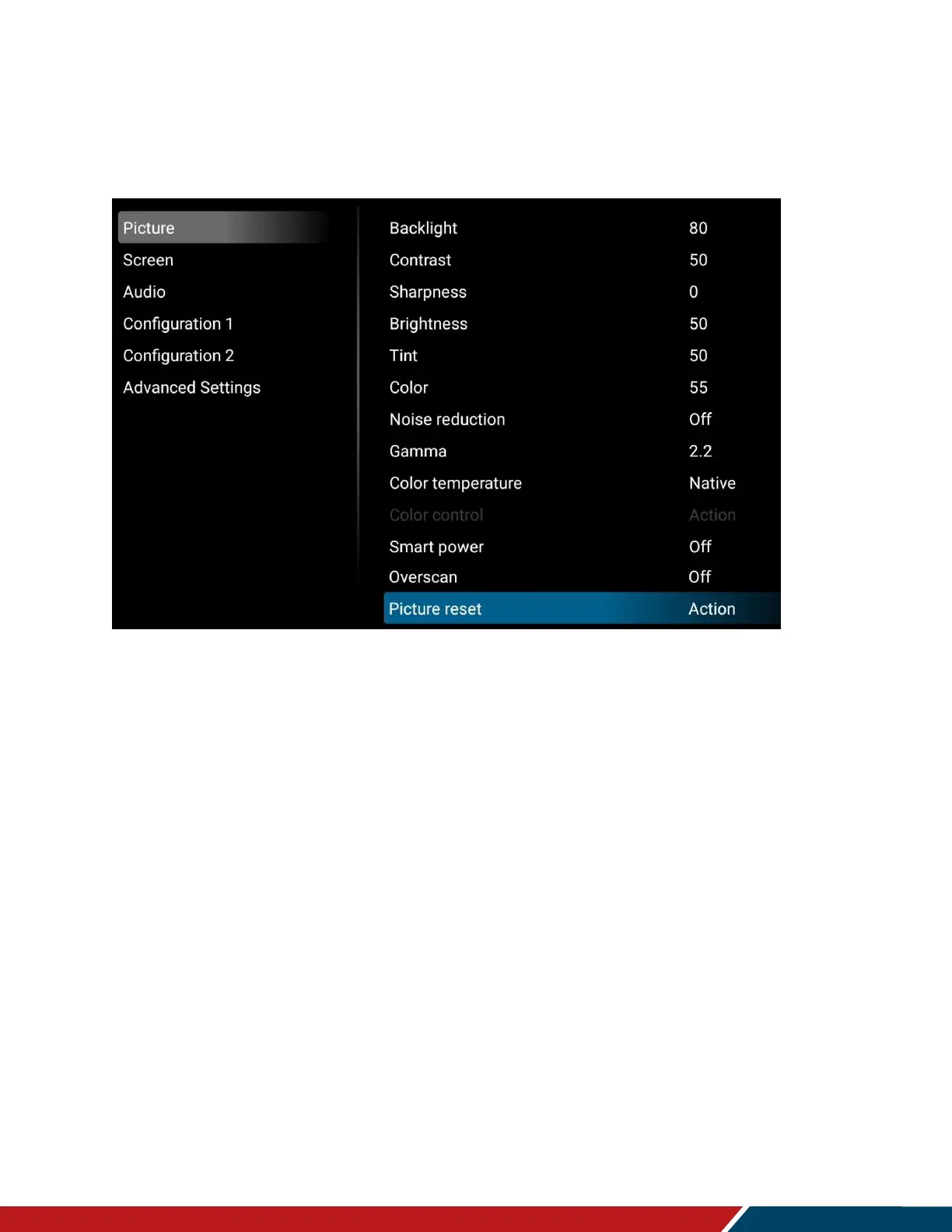 Planar M Series - OSD Main Menu: Picture, Screen, Audio; Picture Settings