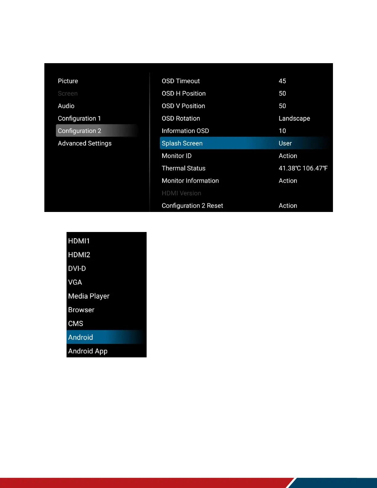 5. Go to the display’s Menu and change the Splash Screen setting to User.