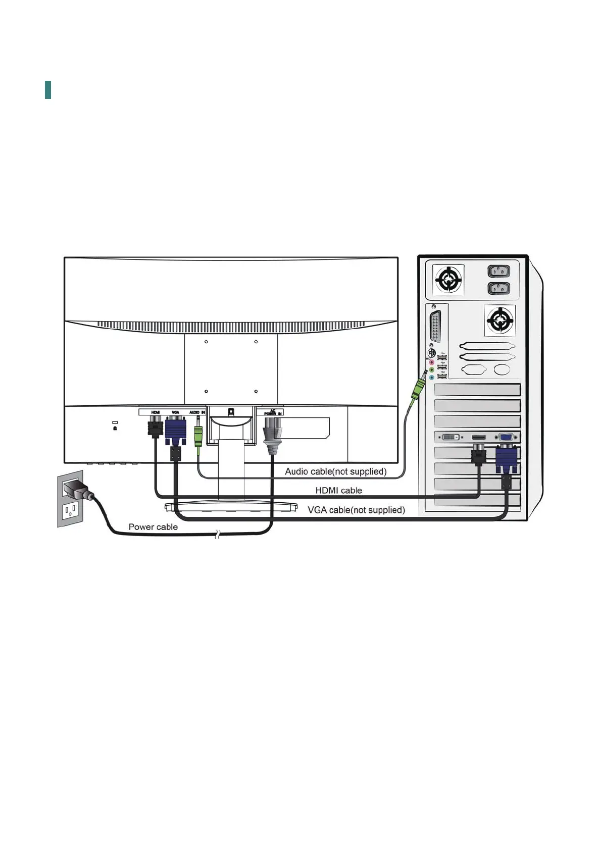 1. Connect either VGA or HDMI Video Source from the monitor to the computer. Make sure