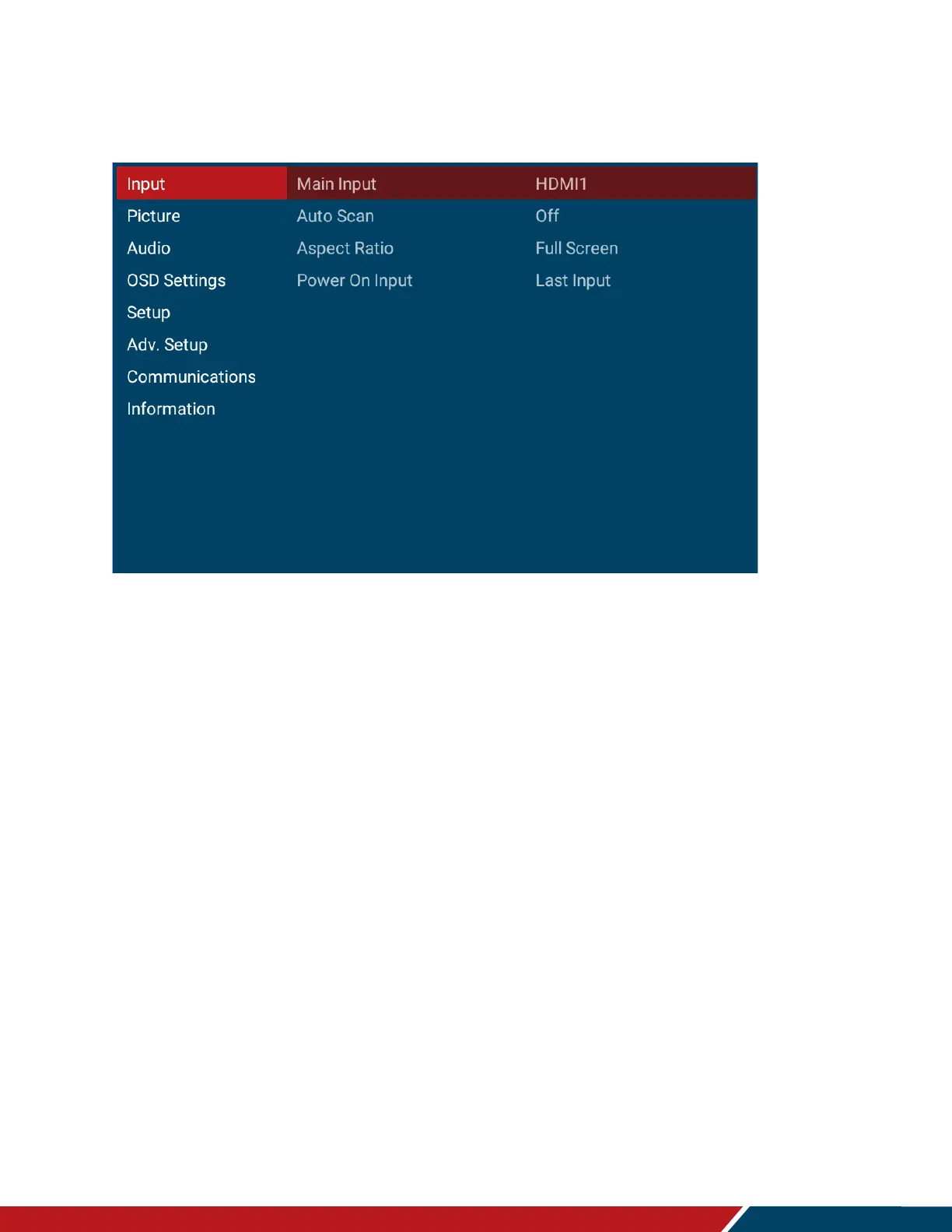 Select the input source to be displayed at power up. Selecting Last Input will cause the