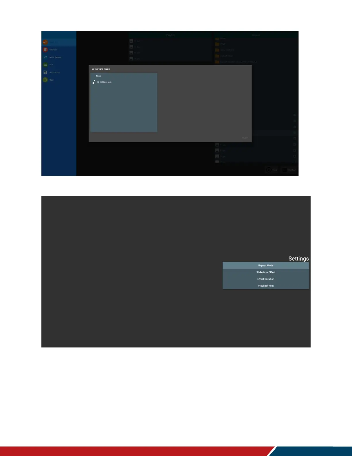 Options: Repeat Once (display each file once), Repeat All (repeat showing all