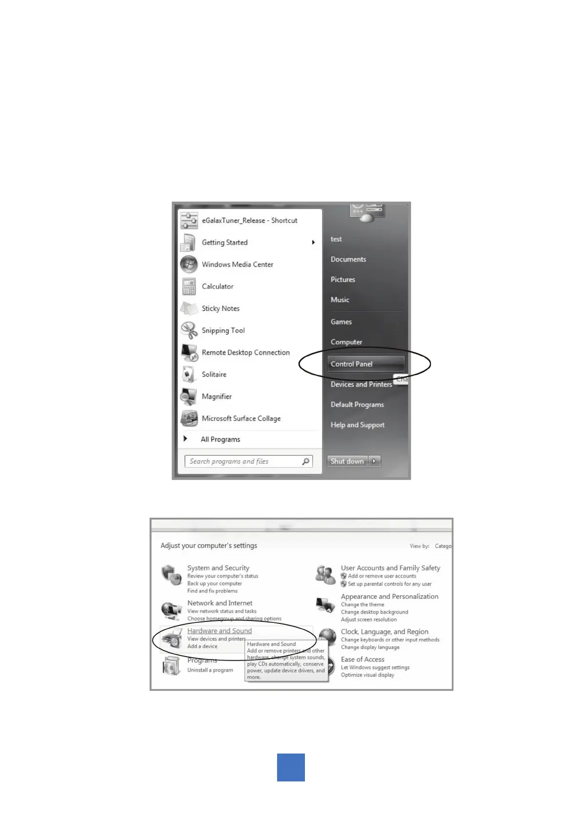 1. Tap the Start button, Control Panel and then Hardware and Sound.
