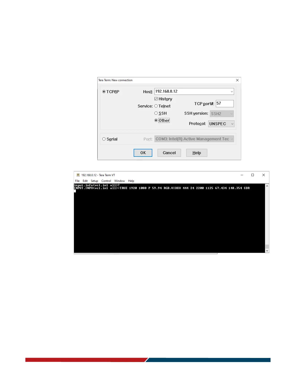 Notice the following in the TCP example below using Tera Term: