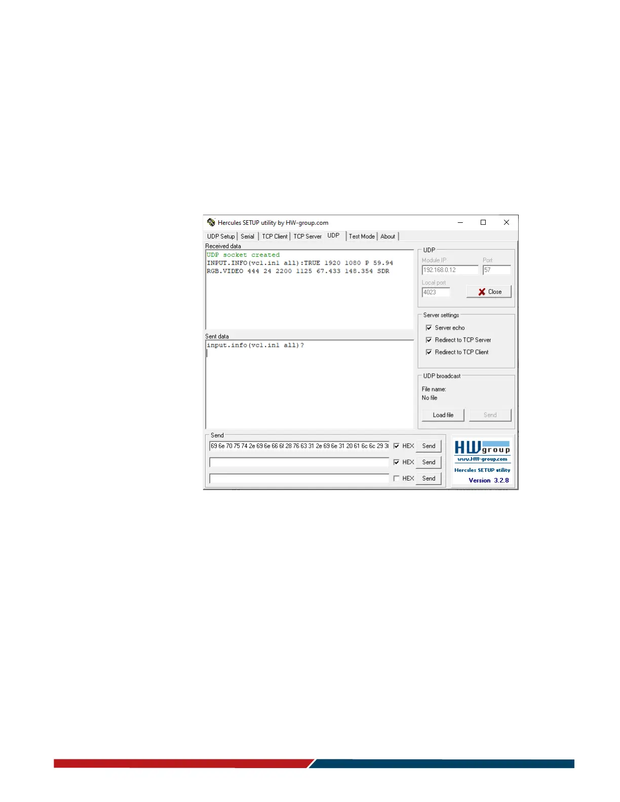 Note: Most UDP terminal programs won’t automatically send the [CR] at the end of the