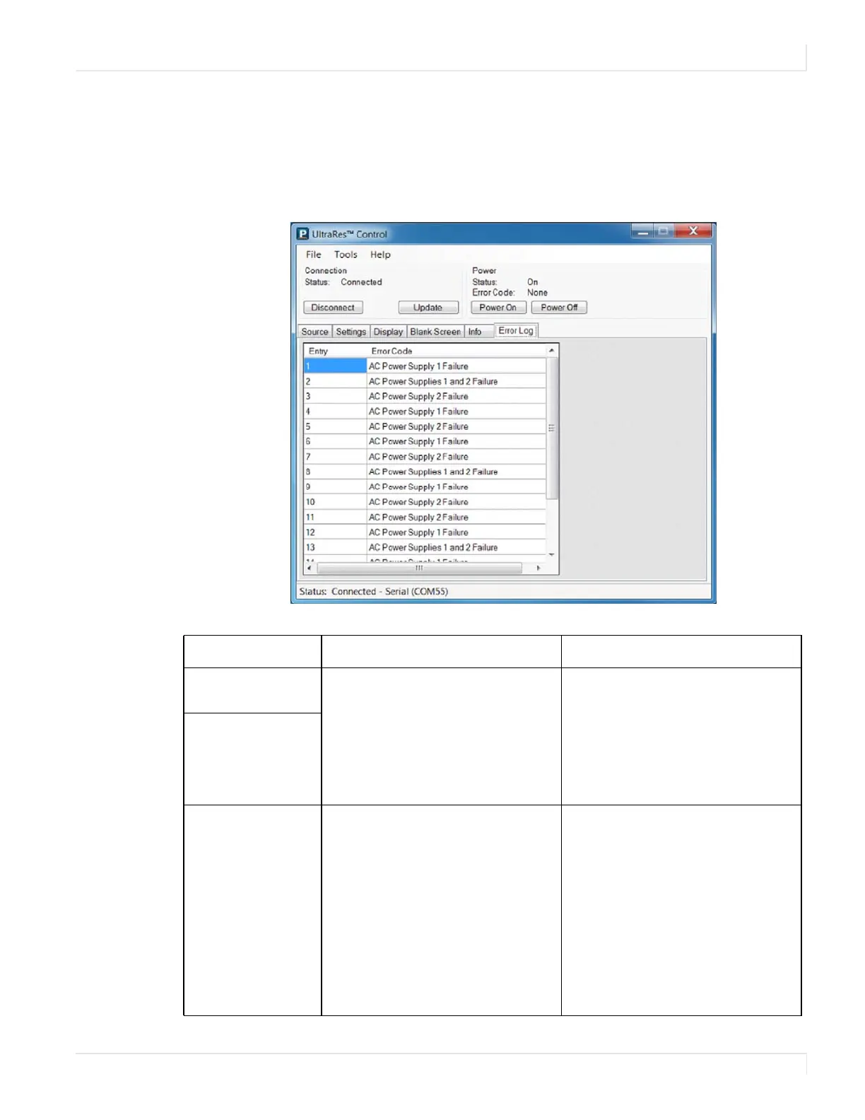 To see the last 50 errors that have occurred, select the Error Log tab in the UltraRes