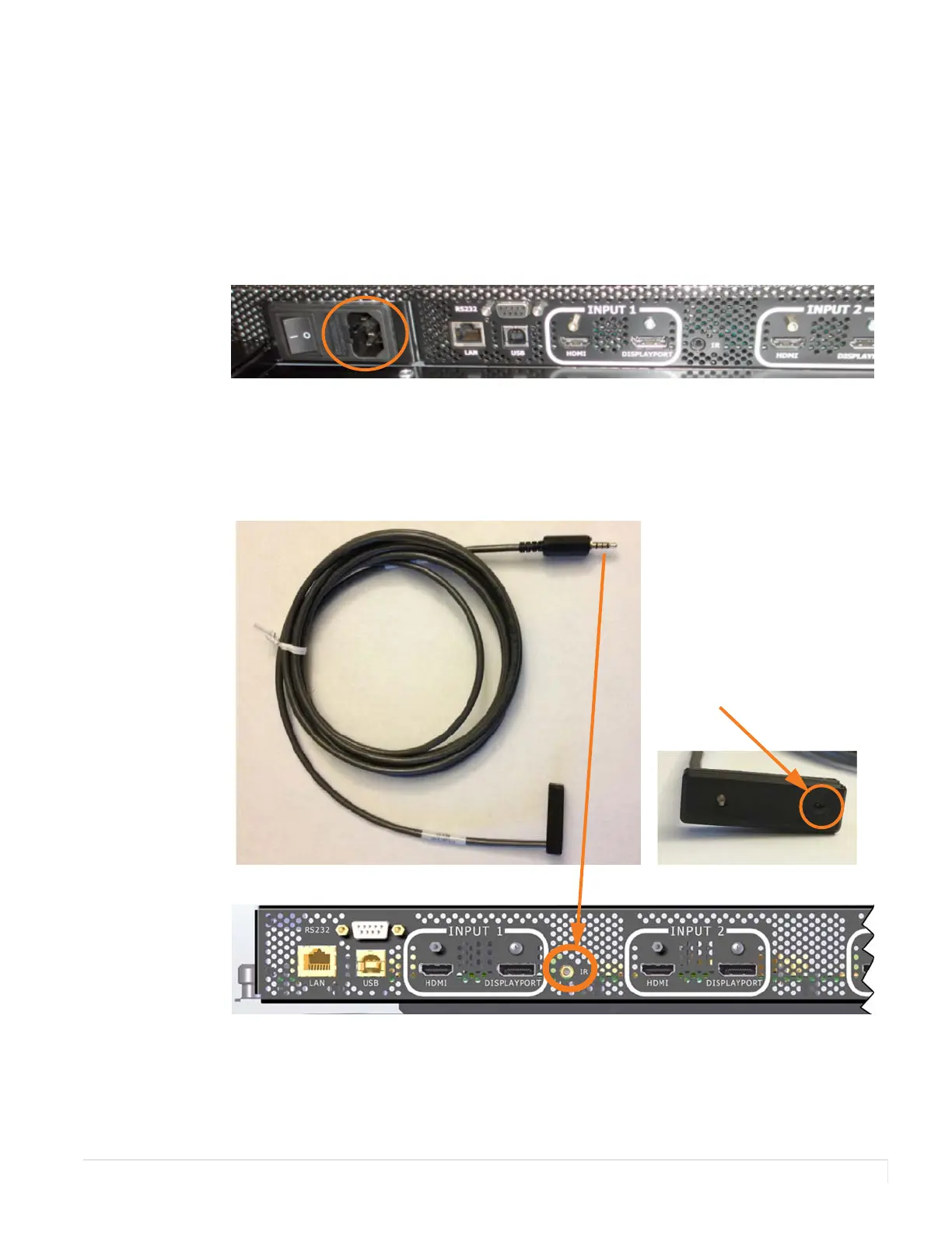 connections: AC power, the wired IR module and your sources.