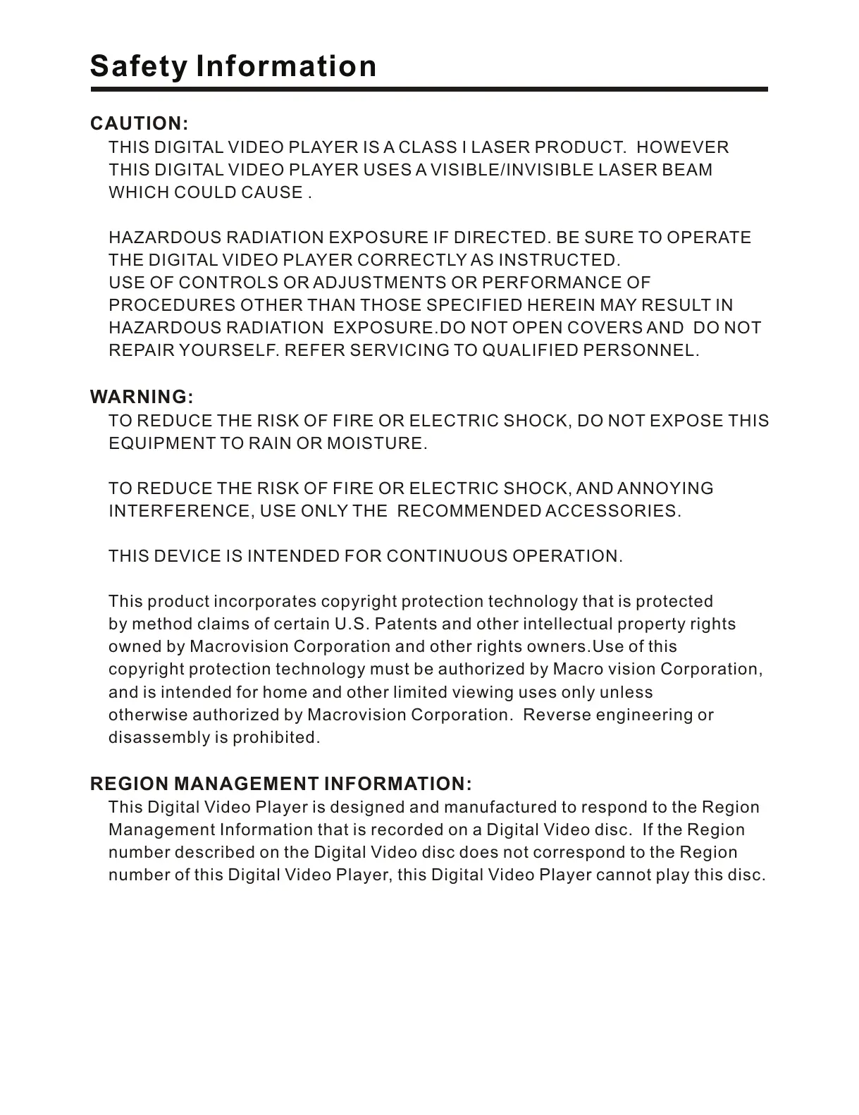 THIS DIGITAL VIDEO PLAYER IS A CLASS I LASER PRODUCT. HOWEVER