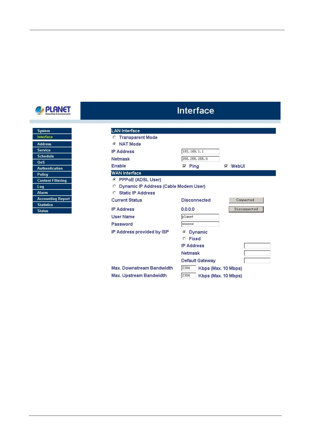 After entering the Bandwidth Management Gateway WEB UI screen, select the Interface tab on the left menu