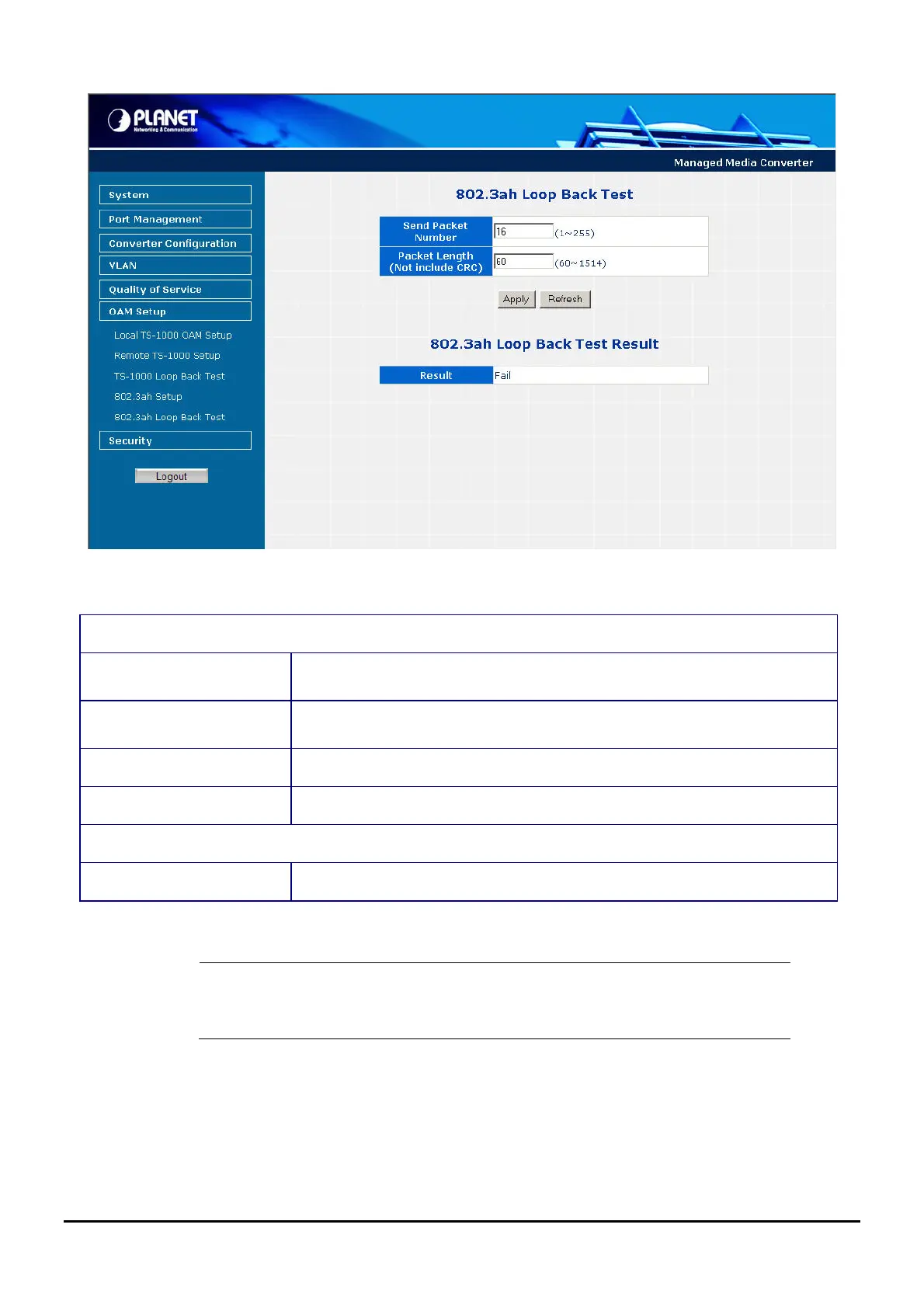 Table 4-16 Descriptions of the 802.3ah Loop Back Test Web Page Screen Objects