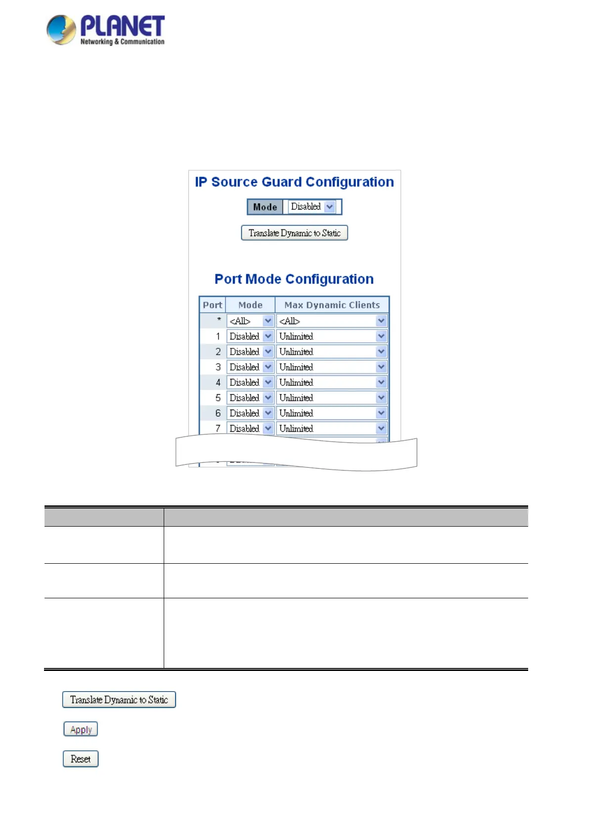Specify IP Source Guard is enabled on which ports. Only when both Global Mode and Port
