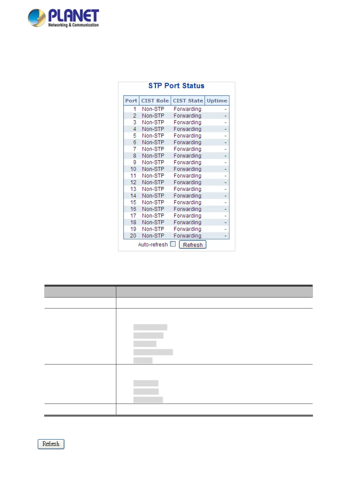 This Page displays the STP CIST port status for port physical ports in the currently selected switch.