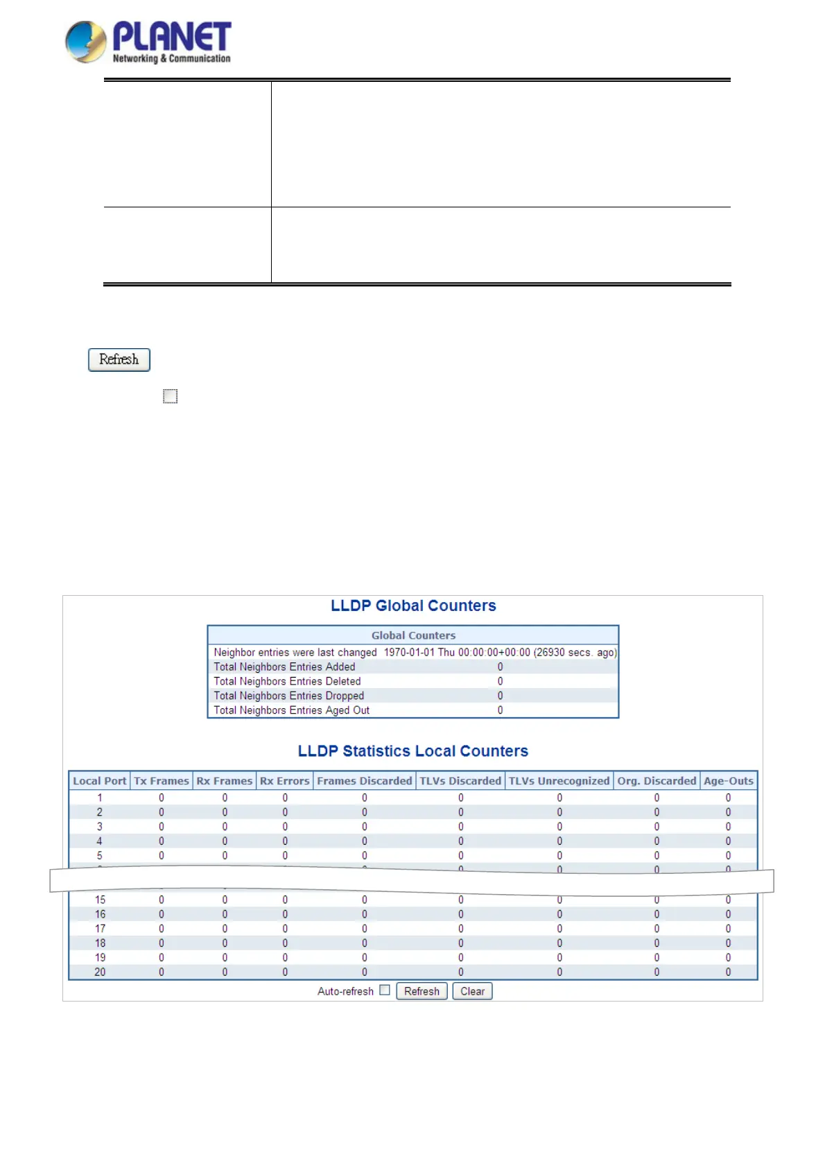 This Page provides an overview of all LLDP traffic. Two types of counters are shown. Global counters are counters that refer to