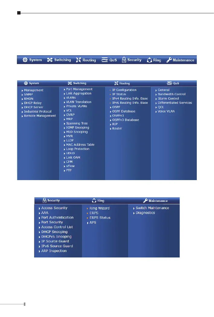 “Routing”, “QoS”, “Security”, “Ring” and “Maintenance”.