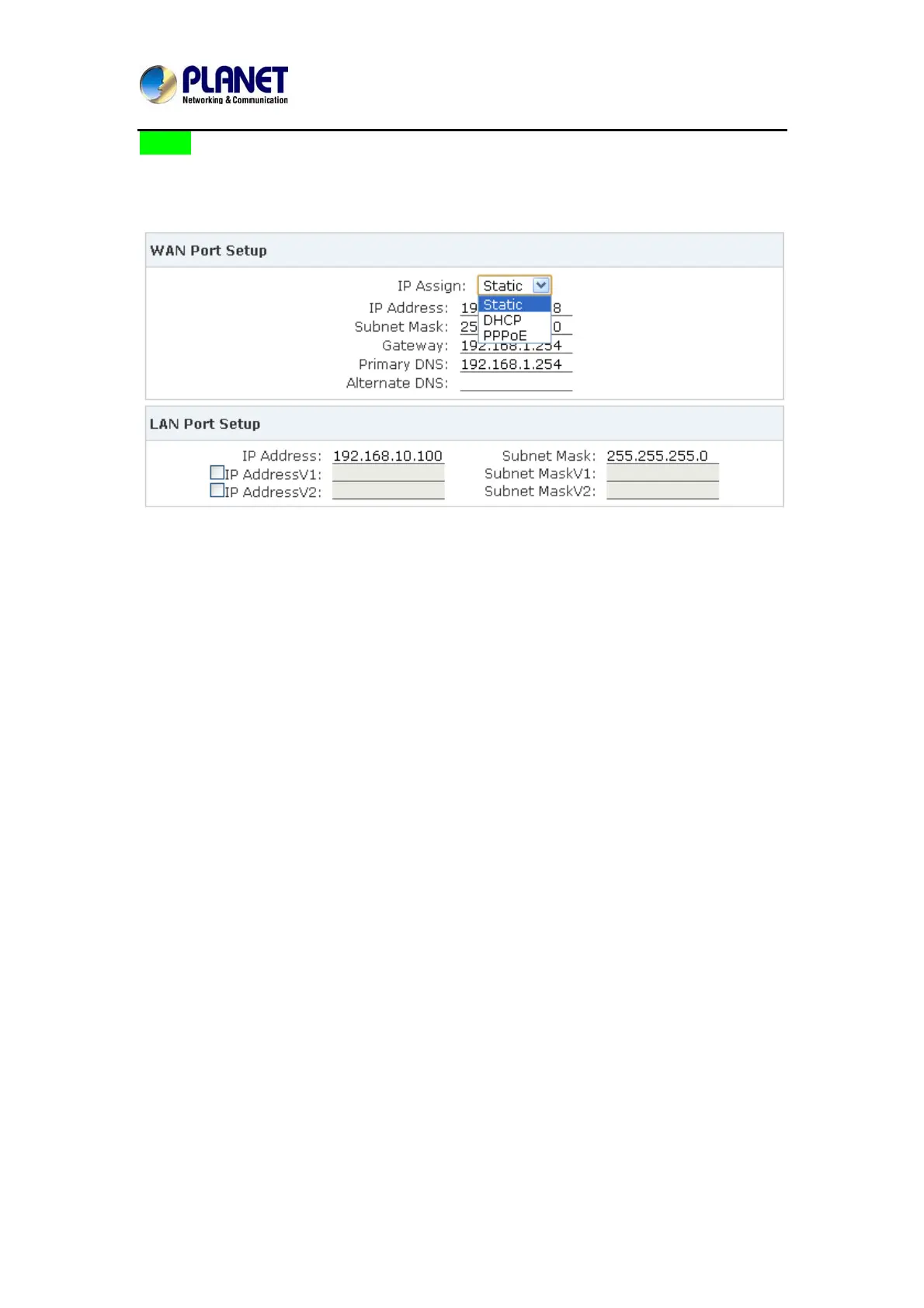 There are three types of Ethernet port connection. They are Static IP, PPPoE (Point-to-Point
