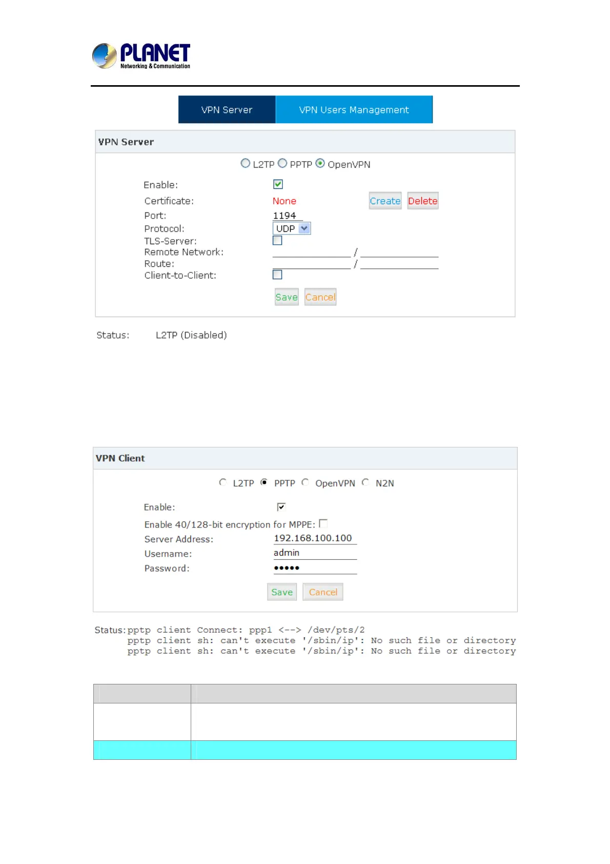 Planet IP PBX supports four kinds of VPN Clients: L2TP, PPTP, OpenVPN and N2N.