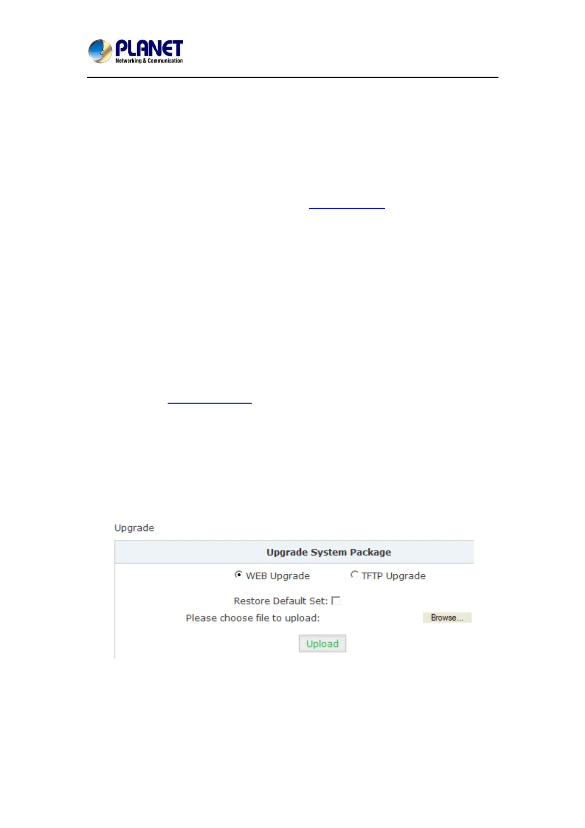 Check “WEB Upgrade” radio button and click “Browse” button to locate the new firmware in