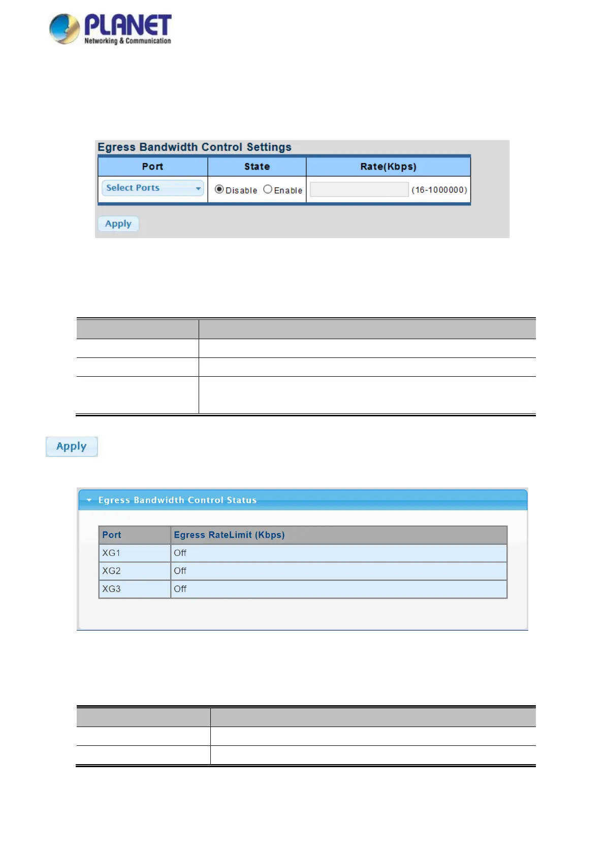 This page provides to select the egress bandwidth preamble. The Egress Bandwidth Control Setting and Status screens in