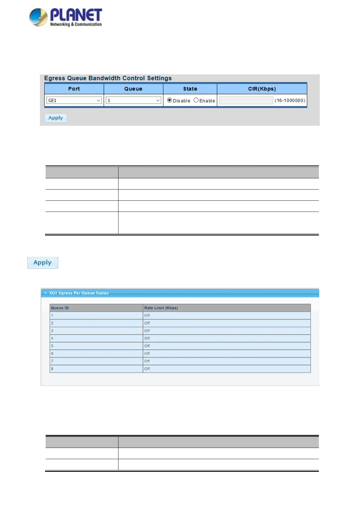 The Egress Queue Bandwidth Control Settings and Status screens in Figure 4-4-21 & Figure 4-4-22 appear.