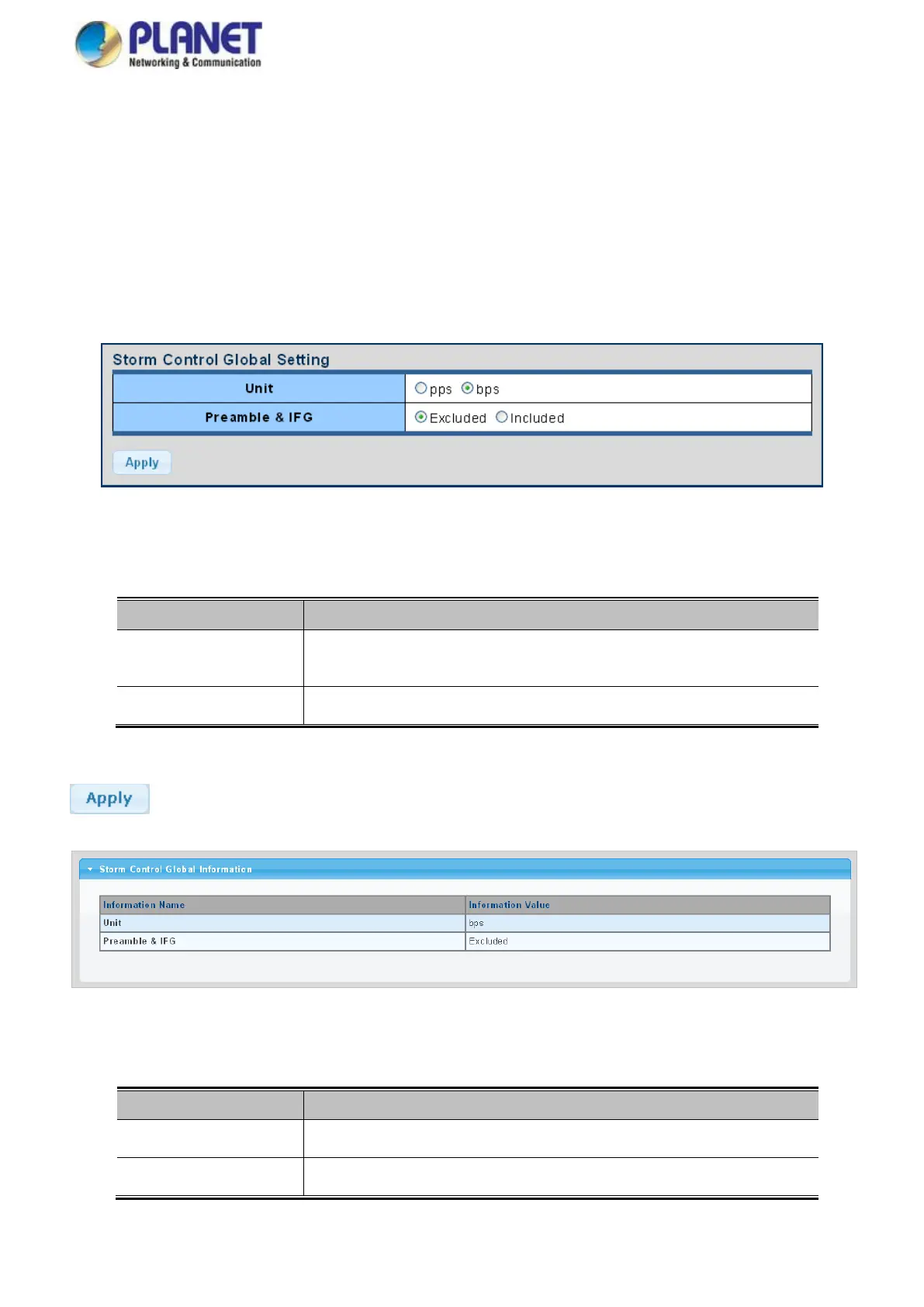 The Storm Control Global Setting and Information screens in Figure 4-4-23 & Figure 4-4-24 appear.