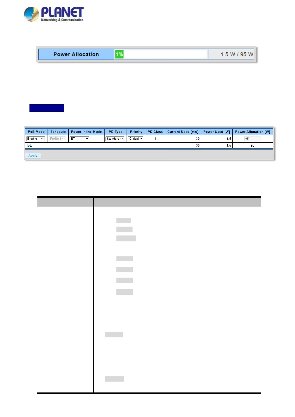 This section allows the user to inspect and configure the current PoE port settings as Figure 4-7-4 shows.