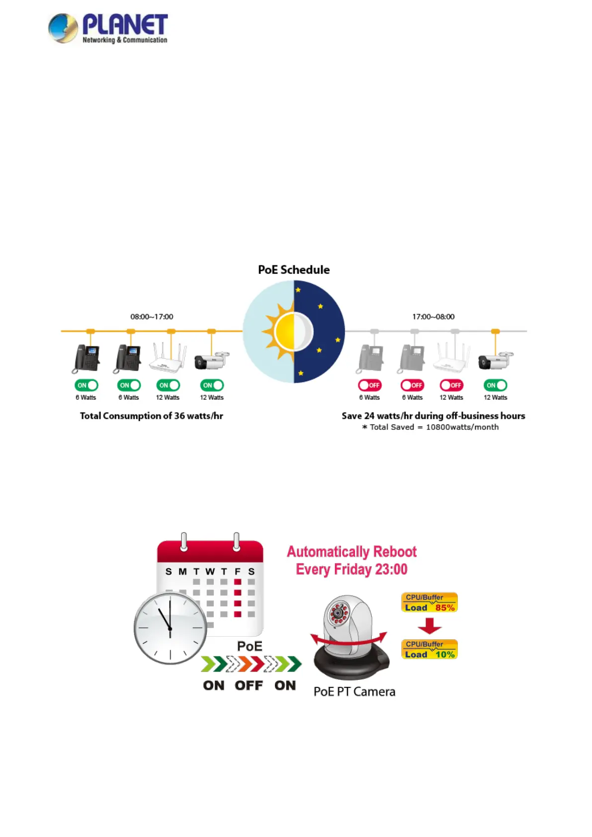 The Managed PoE switch allows each of the connected PoE IP cameras to reboot at a specified time each week. Therefore, it