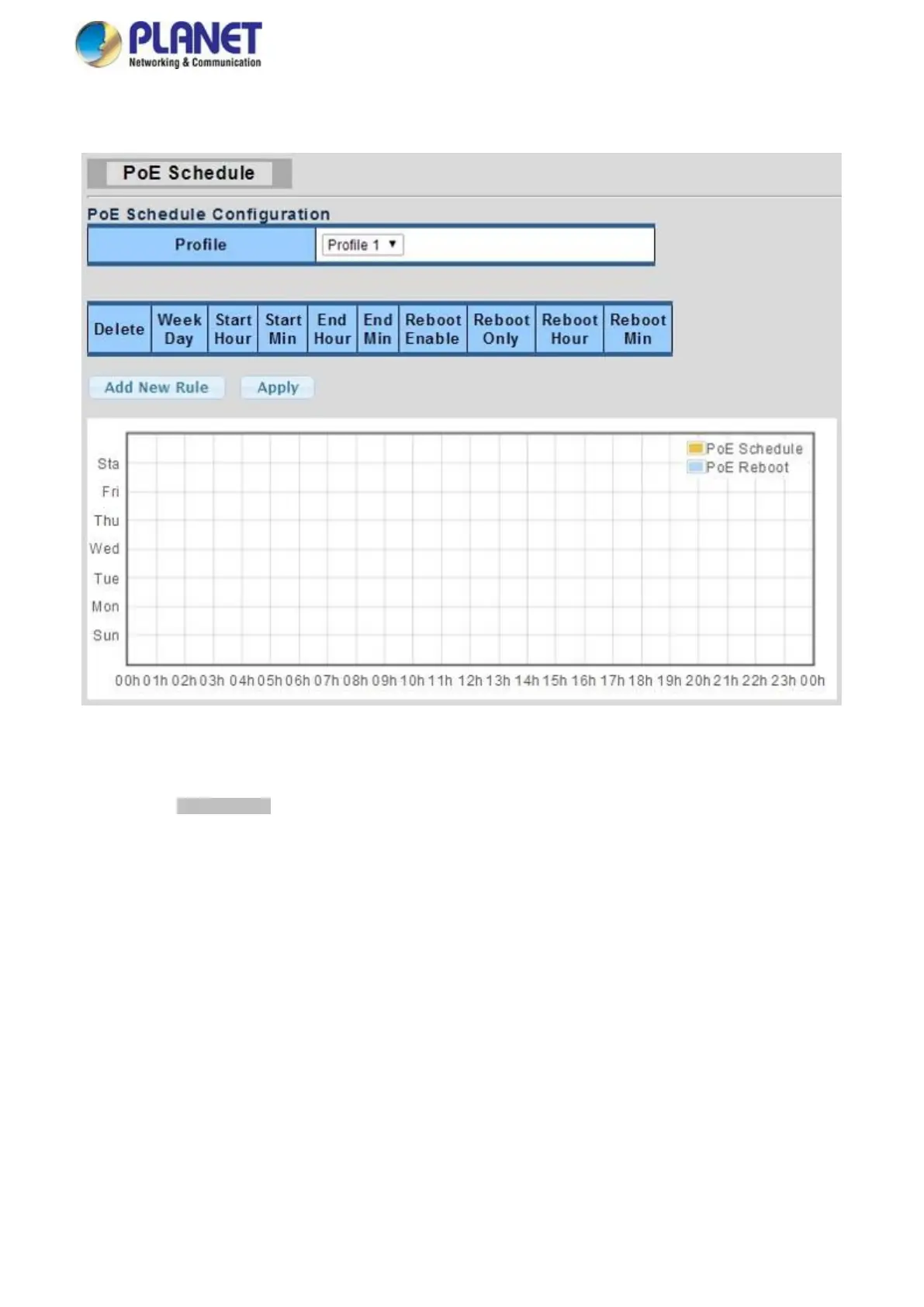 Please press the Add New Rule button to start setting PoE Schedule function. You have to set PoE schedule to profile and then