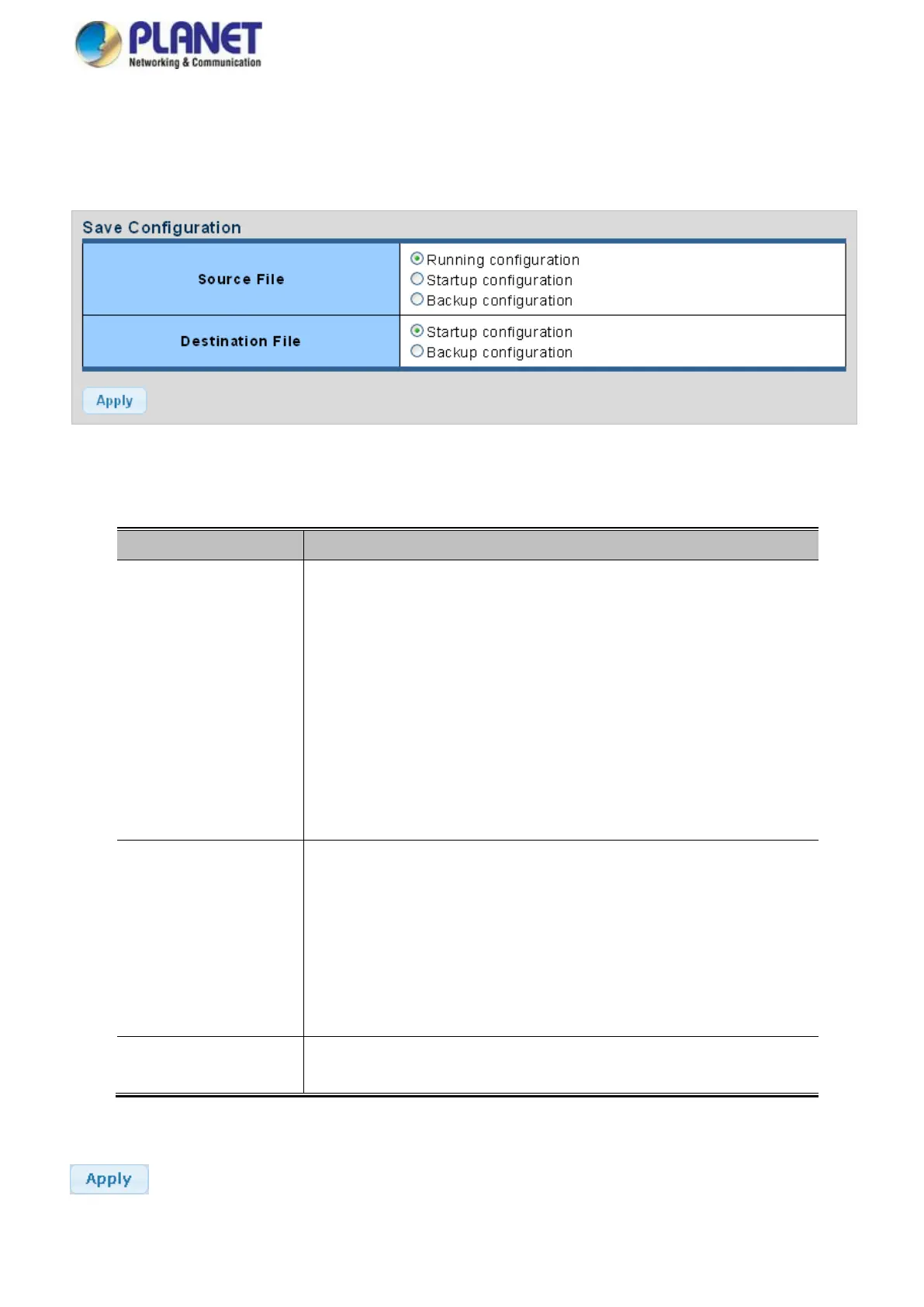 from the RAM to FLASH by saving “Source File = Running Configuration” to