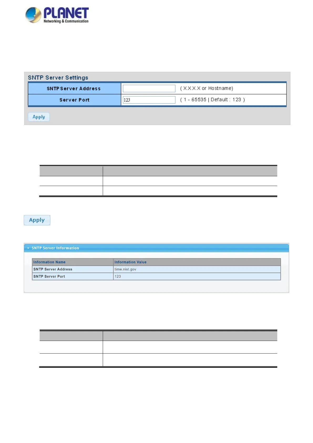 The SNTP Server Configuration screens are shown in Figure 4-2-10 and Figure 4-2-11.