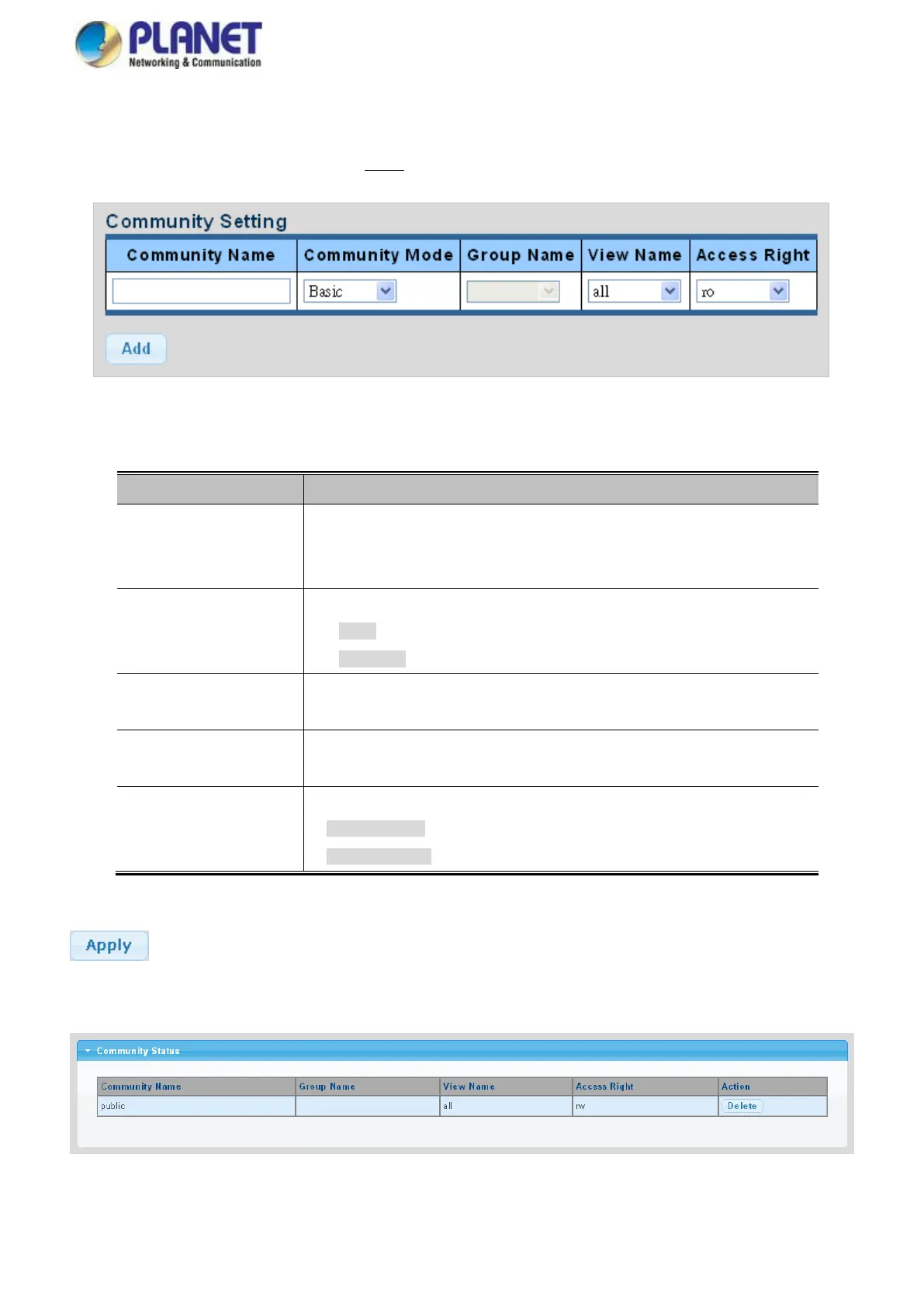 Configure SNMP Community on this page. The SNMP Community screens in Figure 4-2-23 and Figure 4-2-24 appear.