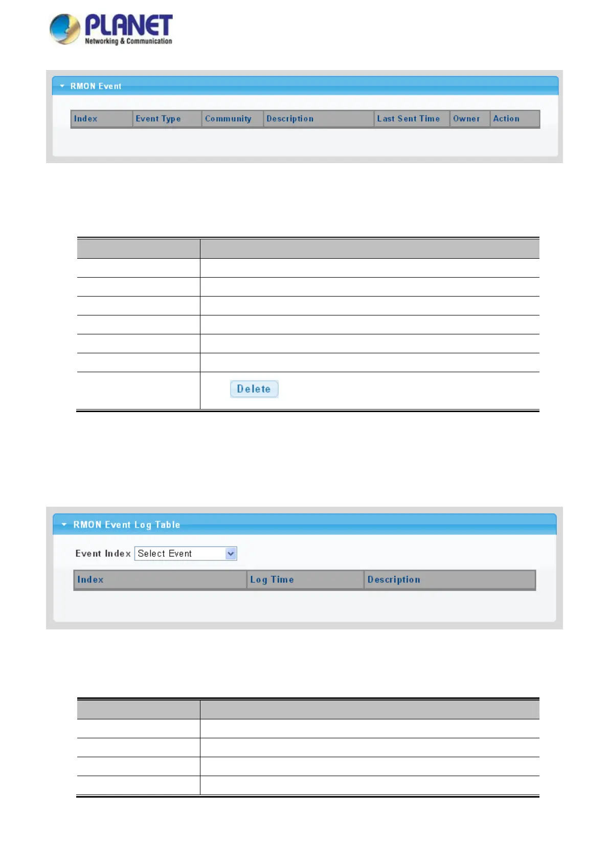 This page provides an overview of RMON Event Log. The RMON Event Log Table screen in Figure 4-2-42 appears.