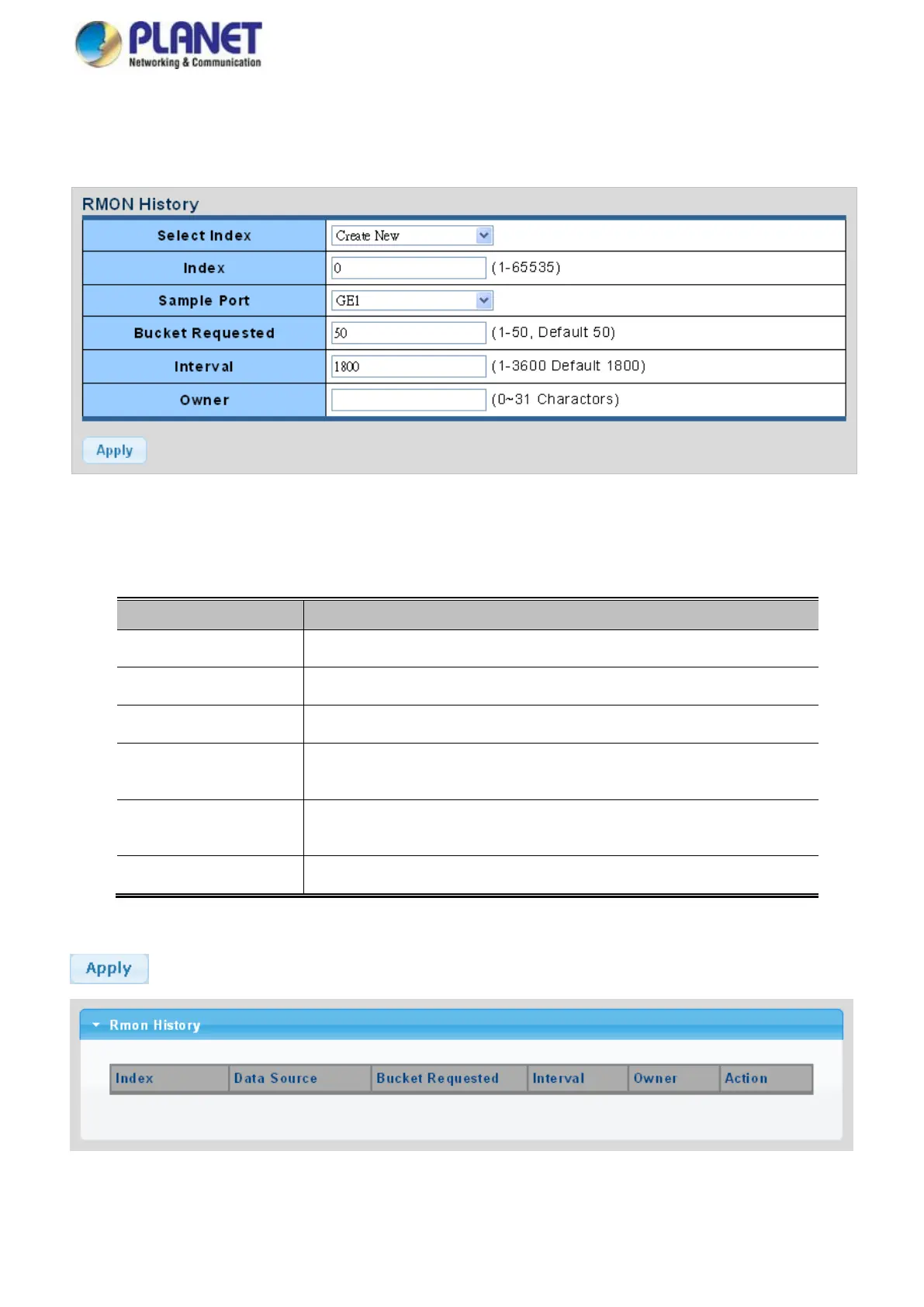 Configure RMON History table on this page. The RMON History screens in Figure 4-2-45 and Figure 4-2-46 appear.