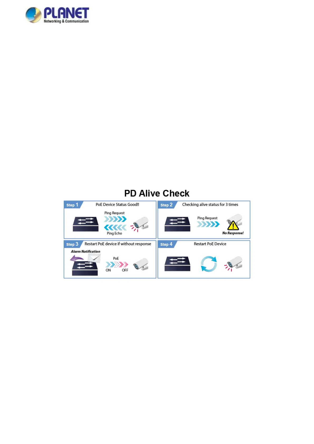 action. If a PD stops working and responding, the IXT-900 PoE series will recycle the PoE port power and bring the PD back to