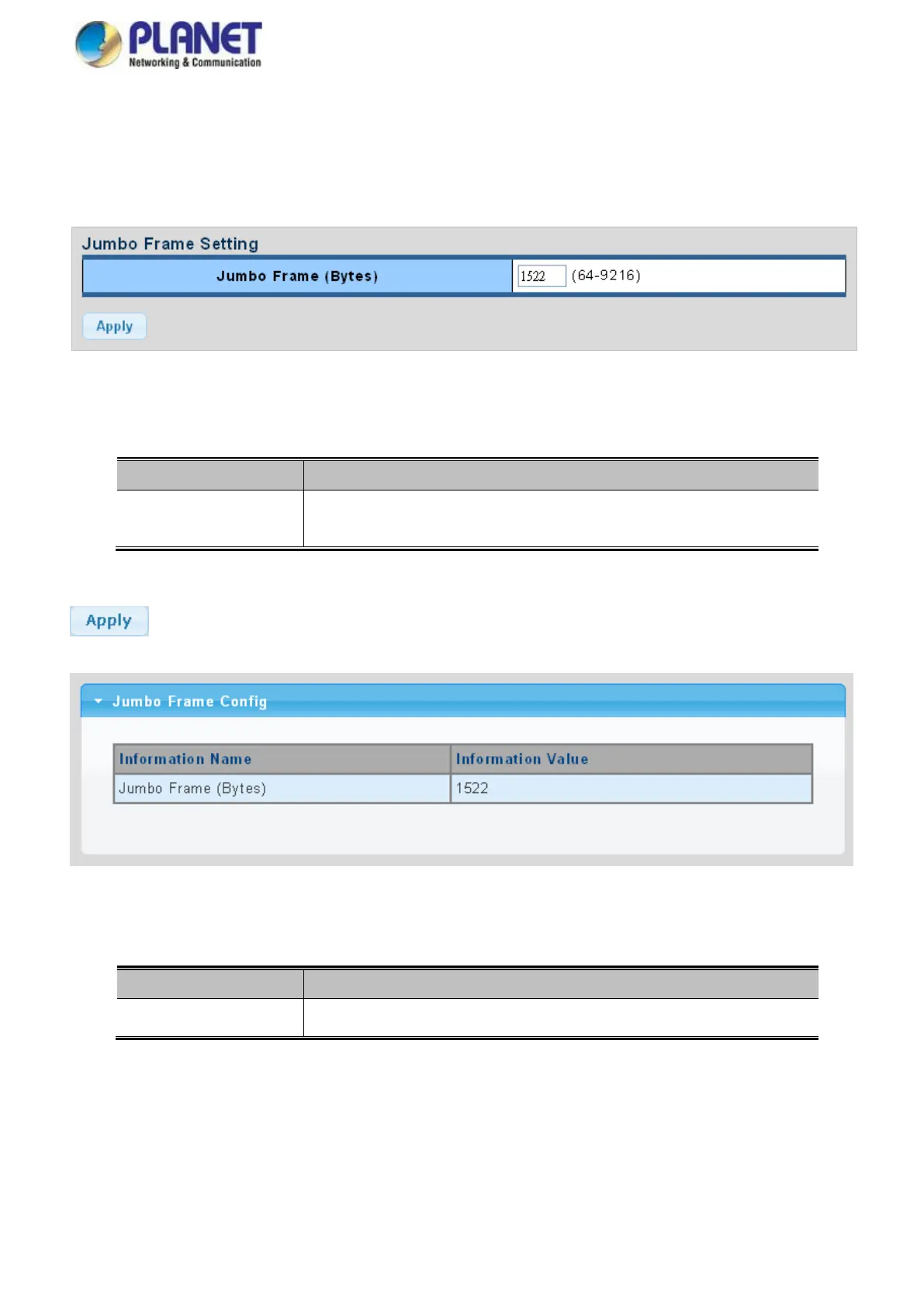 This page provides to select the maximum frame size allowed for the port. The Jumbo Frame screen in Figure 4-3-10 and