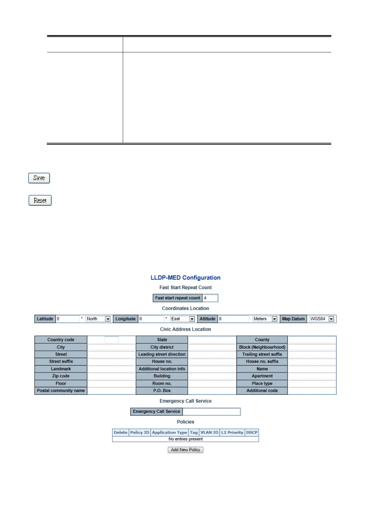 This page allows you to configure the LLDP-MED. The LLDP-MED Configuration screen in Figure 4-14-2 appears.