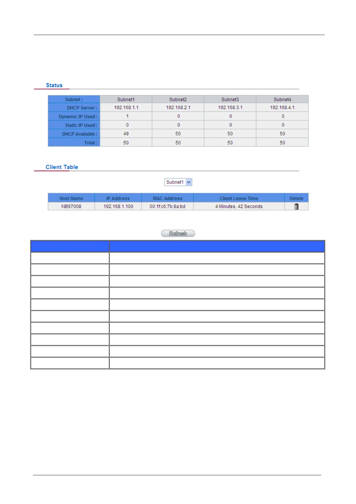 This is an indication list of the current status and setup record of the DHCP server. The indications are for the