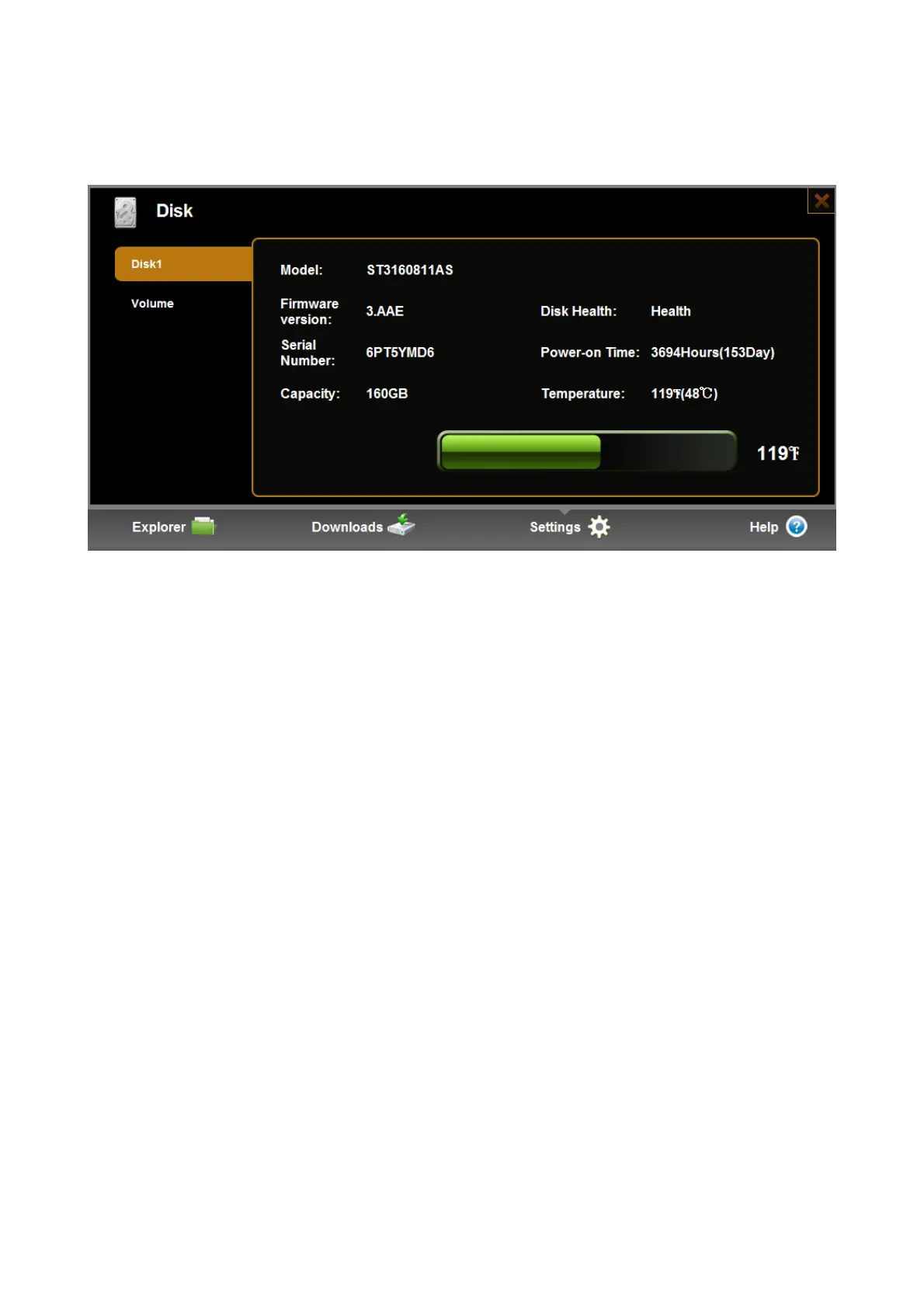 1) Disk : Here is the hard disk physical information. Administrator can check disk model, Power on time, disk
