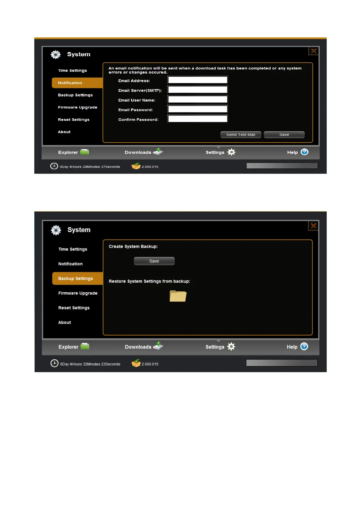 Backup settings are used to save the current setting parameters of the Device system. Also you can restore