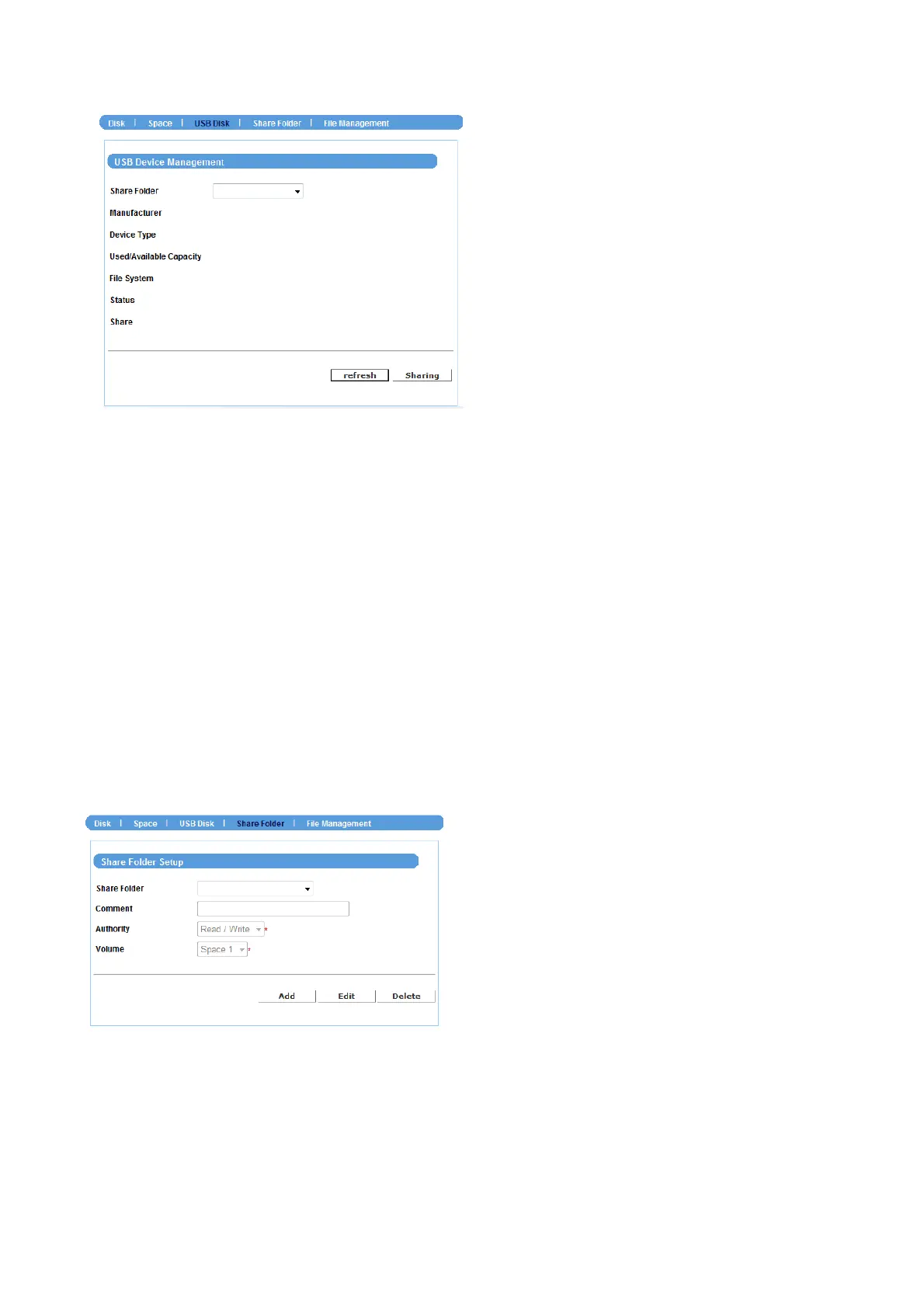 This sub-menu allows you to specify the shared folder of the disks. Click Add and then