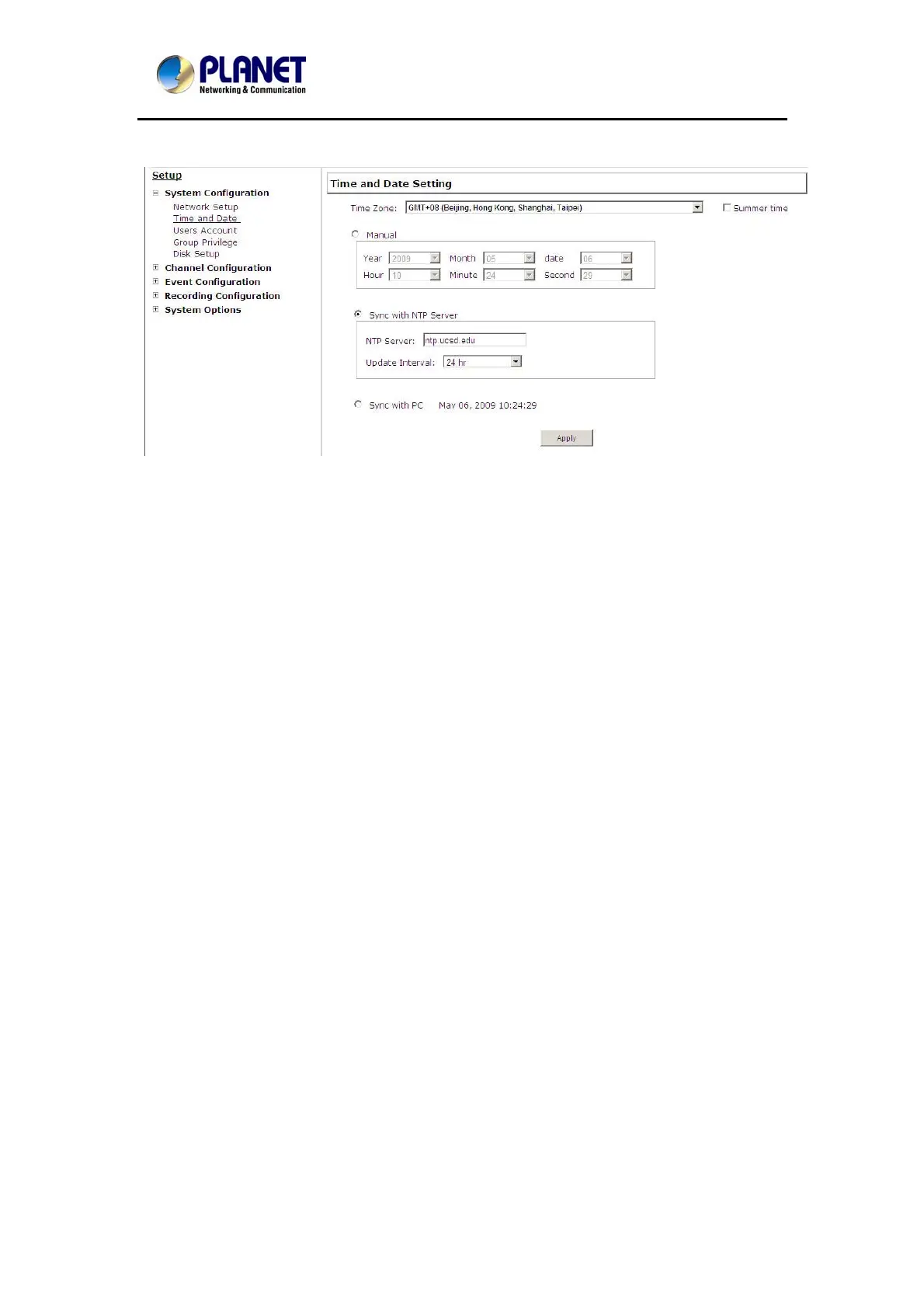• Sync with NTP server – enter the host name or IP address of a valid NTP server and set
