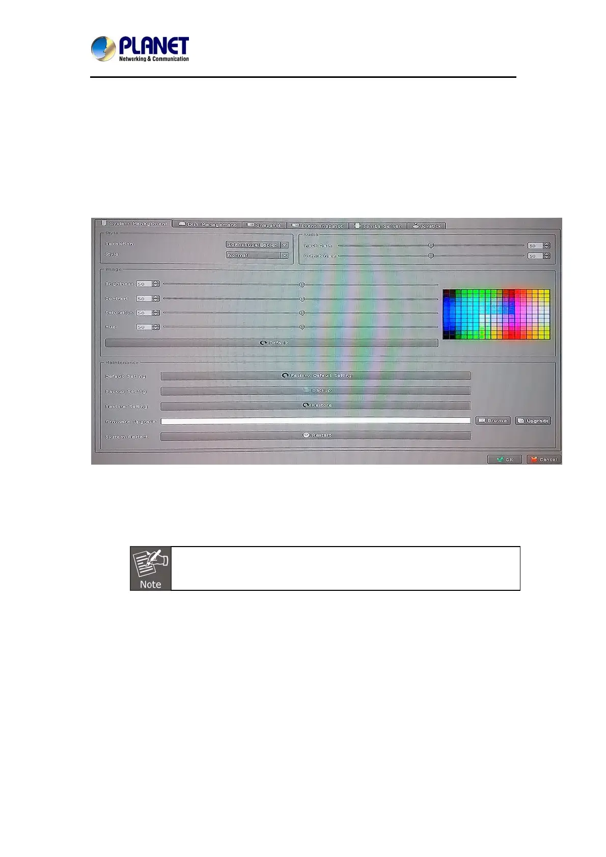 The system management is for you to set up the NVR for video image, return to default,