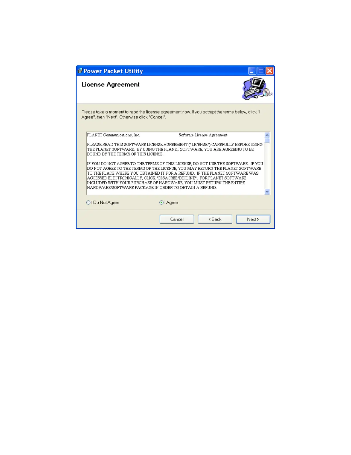 terms below, click ”I Agree”. Then “Next“. Otherwise click” Cancel”.